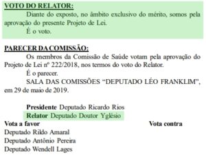 No relatório que emitiu pela aprovação do projeto, Yglésio assinalou: “Analisando o Projeto de Lei nº 222/2018 proposto pelo Senhor Deputado Adriano que dispõe sobre a obrigatoriedade da apresentação da carteira de vacinação no ato da matrícula escolar, observa-se a importância do mesmo para a população maranhense. […] Pode-se afirmar que o Projeto de Lei está amparado no princípio da finalidade”.