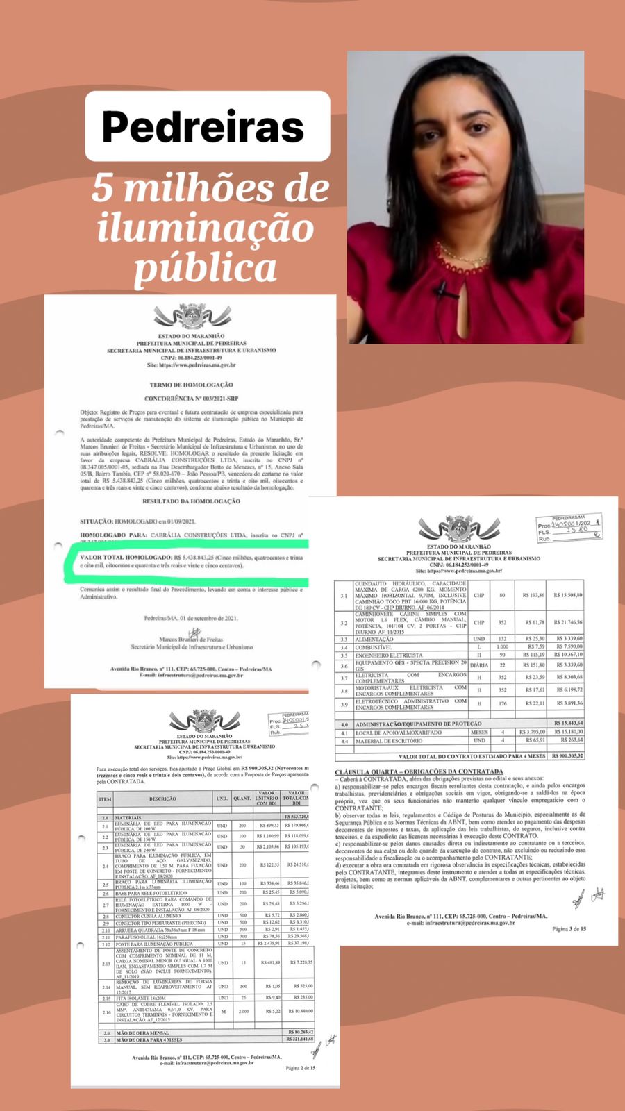 A prefeita Vanessa Maia (PDT), da cidade de Pedreiras, contratou uma empresa privada para manutenção da iluminação pública do município no valor de R$ 5.438.843,25 (Cinco milhões, quatrocentos e trinta e oito mil, oitocentos e quarenta e três reais e vinte e cinco centavos). De acordo com o contrato 20220578/2022, a equipe contempla profissionais como engenheiro elétrico, eletricista, eletrotécnico, auxiliar eletricista, motoristas, além de lâmpadas, material elétrico em abundância e até postes de concreto. Veículos como um caminhão e uma caminhonete também integram o contrato celebrado.