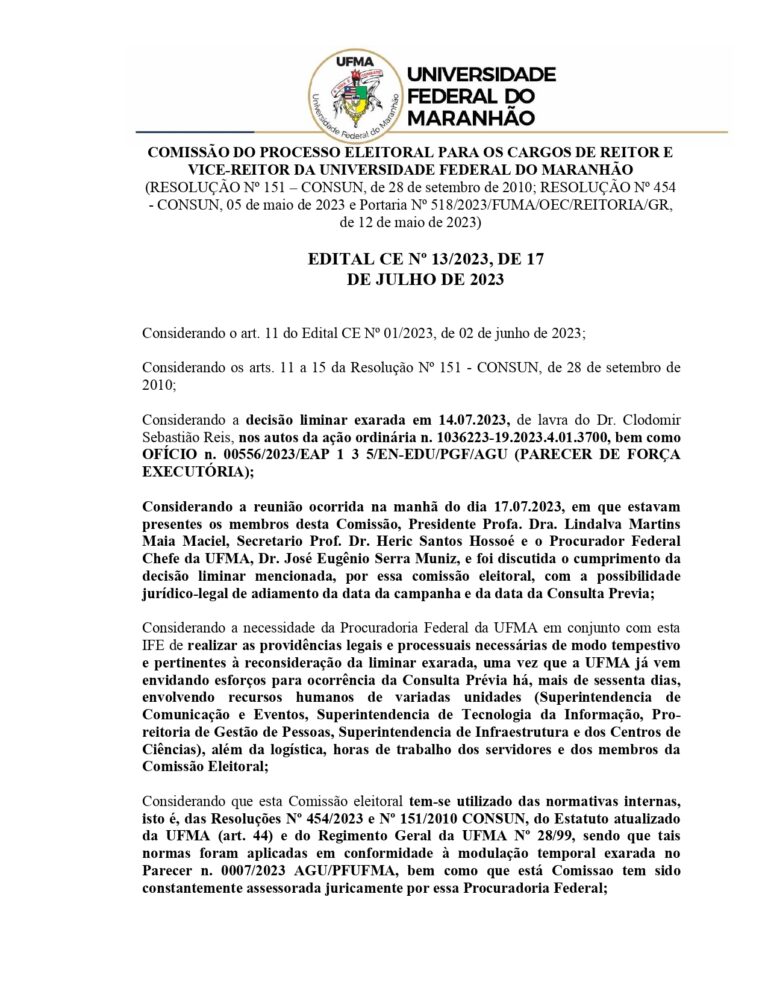 A decisão de suspender as eleições, inicialmente agendadas para esta terça-feira (18), veio após uma determinação da Justiça Federal, que exigiu que a Comissão Eleitoral se abstivesse de utilizar a Resolução nº 454/CONSUN, a qual regula o processo de Consulta Prévia à Comunidade Universitária na modalidade remota e eletrônica, para indicar os novos dirigentes da UFMA.