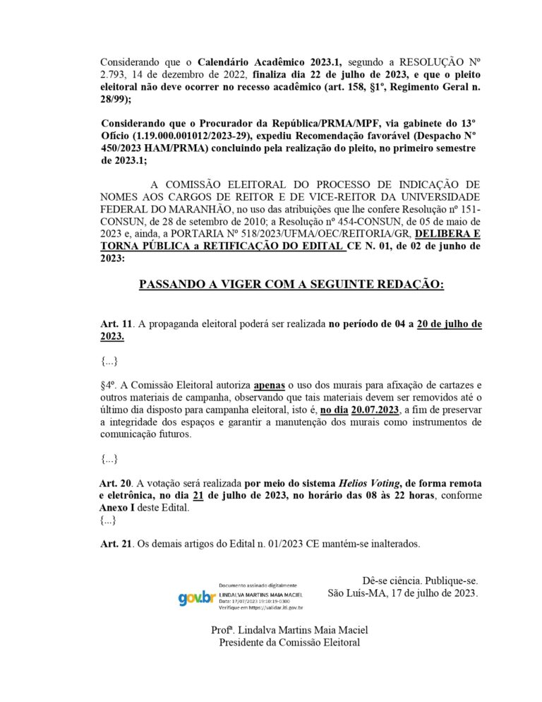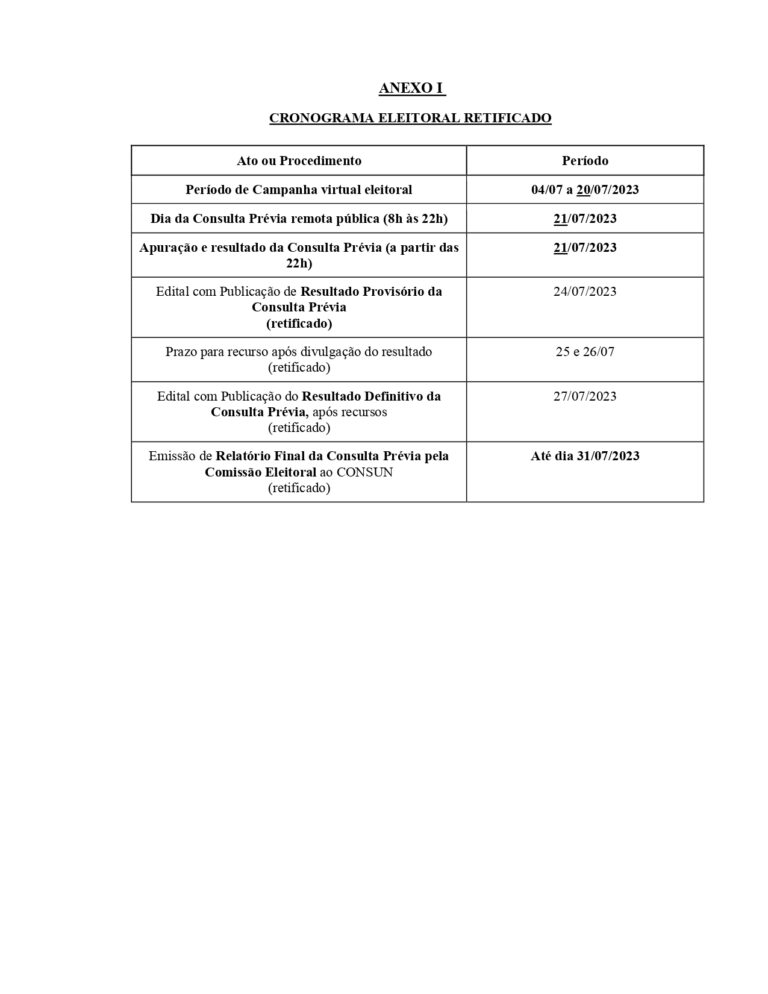 A Comissão Eleitoral da Consulta Prévia publicou uma retificação ao edital, prorrogando o período eleitoral e estabelecendo a nova data para a realização do pleito, que continuará sendo realizado de forma virtual.