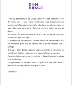 O caso teria acontecido na última quarta-feira (20). Uma aula de judô, que seria ministrada no ambiente em que um aluno do colégio foi flagrado fumando, foi cancelada.