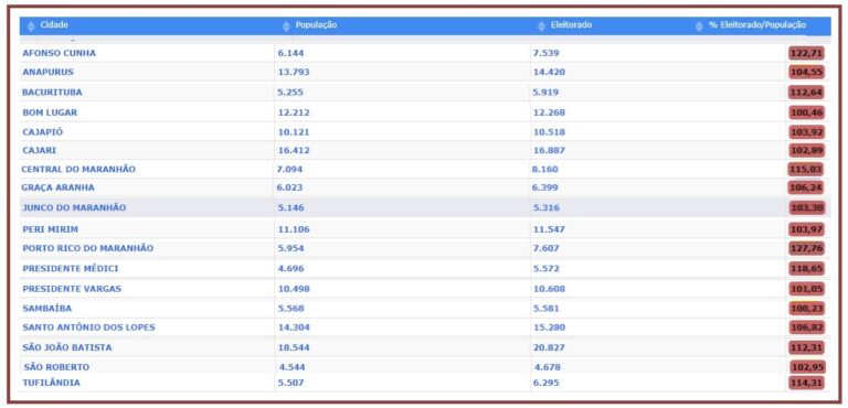 Em São João Batista é verificada a maior discrepância, 2.283 eleitores a mais do que os 18.544 habitantes. Já a menor diferença é vista em Porto Rico do Maranhão, que registra 1.653 votantes que se somam aos 5.954 moradores.
