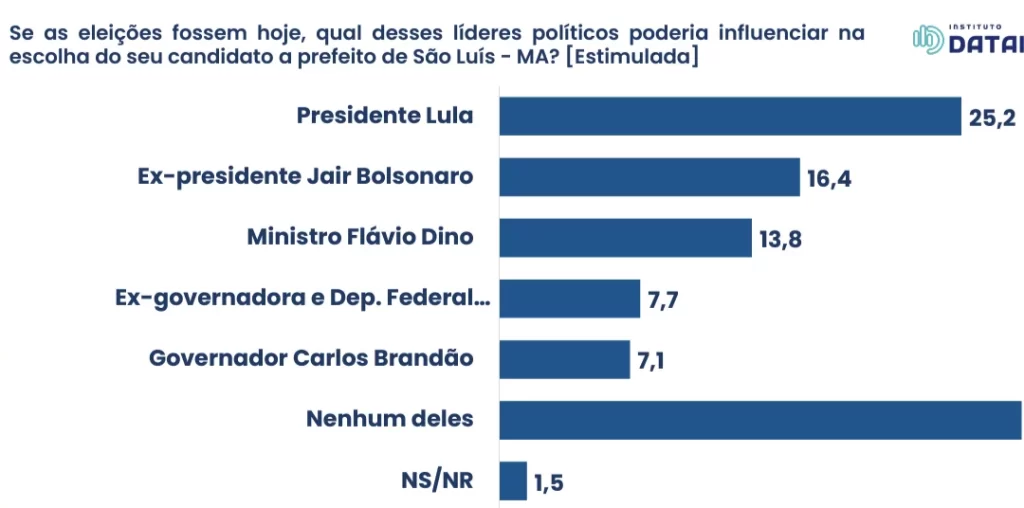O presidente Luiz Inácio Lula da Silva foi citado por 25,2% dos entrevistados, seguido pelo ex-presidente Jair Bolsonaro, mencionado por 16,4%. Flávio Dino teria influência menor que o ex-presidente, já que apenas 13,8% afirmaram que votariam em um candidato por ele indicado.