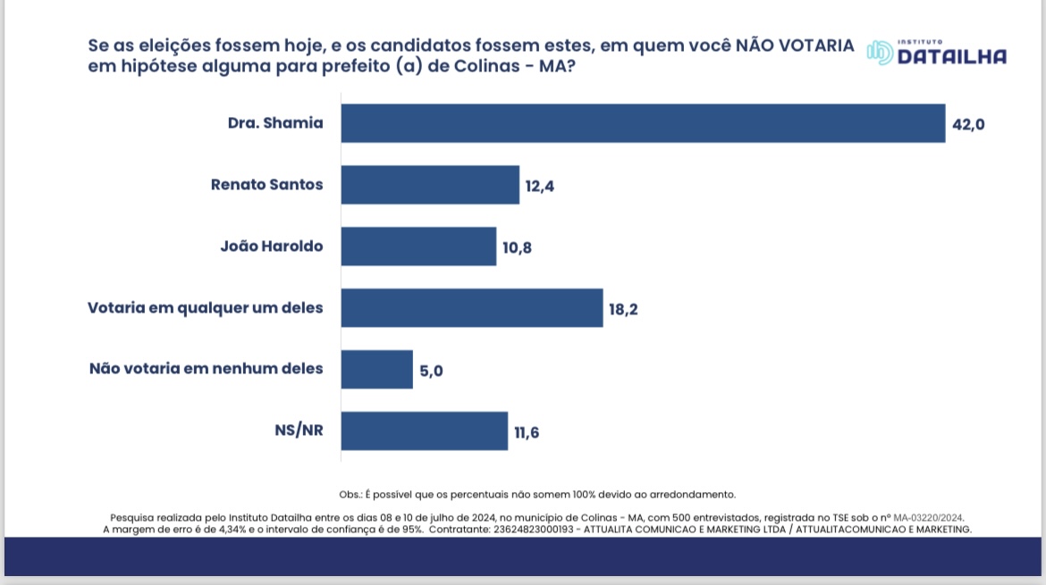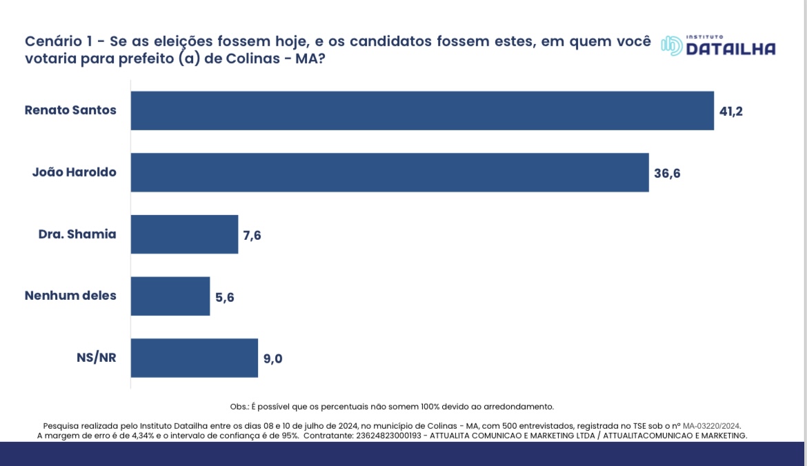 O Datailha ouviu 500 eleitores em todas as regiões do município de Colinas entre os dias 8 e 10 de julho. A margem de erro da pesquisa é de 4,34% para mais ou para menos e o nível de confiança é de 95%. A pesquisa foi registrada no TSE sob o código MA-03220-2024.