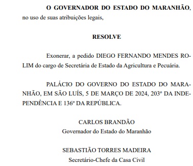As alterações no secretariado do governador Carlos Brandão (PSB) começaram a ser implementadas. Embora ainda não oficialmente anunciadas, o Diário Oficial da terça-feira (5) já reflete mudanças na gestão do Departamento Estadual de Trânsito (Detran) e na Secretaria Estadual de Agricultura e Pecuária (Sagrima).