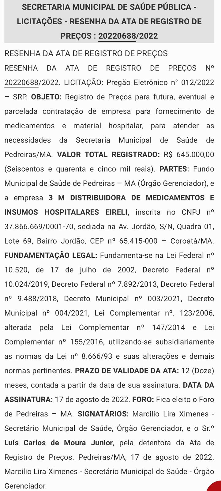 3 M DISTRIBUIDORA DE MEDICAMENTOS E INSUMOS HOSPITALARES EIRELI, valor R$ 645.000,00 (Seiscentos e quarenta e cinco mil reais);