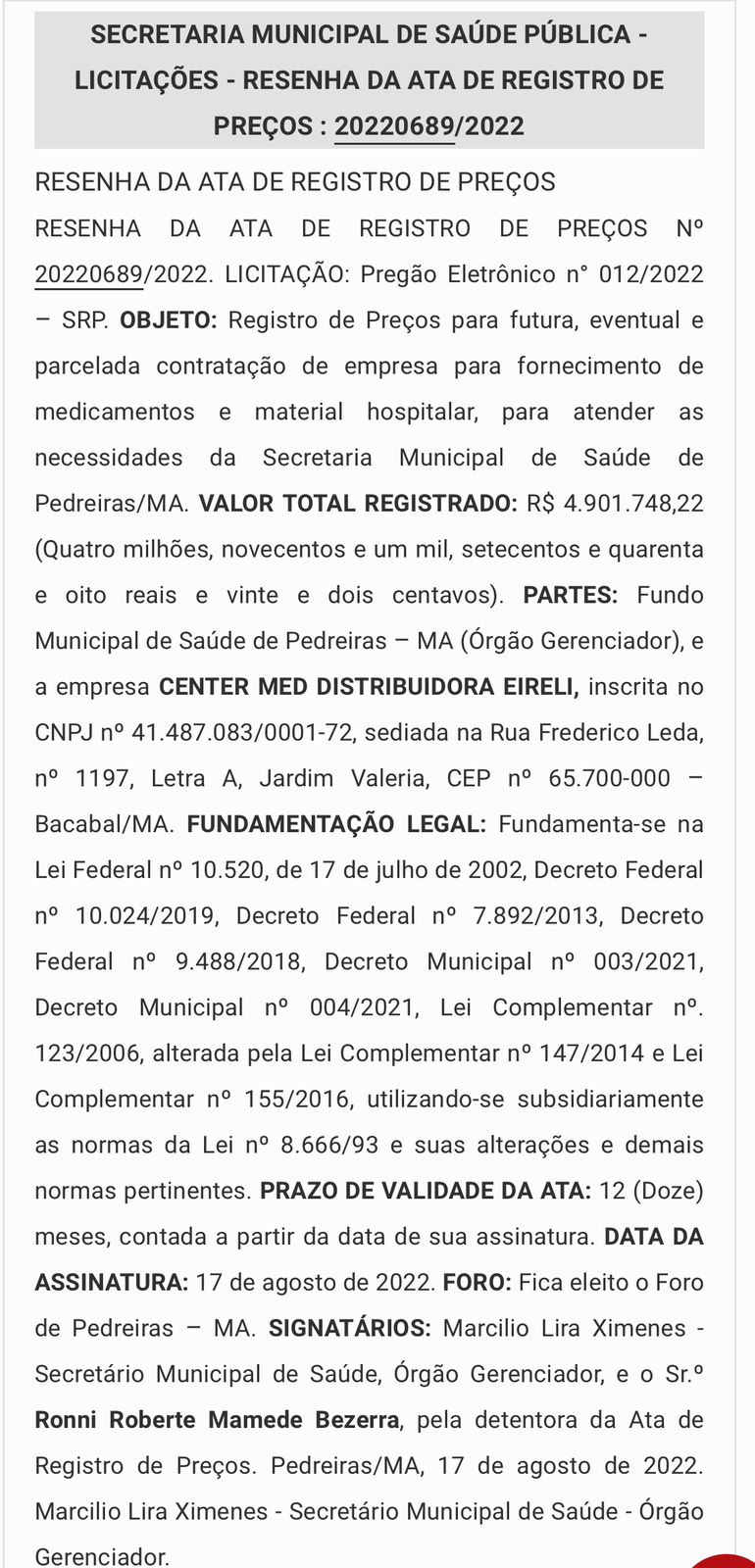 CENTER MED DISTRIBUIDORA EIRELI, valor R$ 4.901.748,22 (Quatro milhões, novecentos e um mil, setecentos e quarenta e oito reais e vinte e dois centavos);