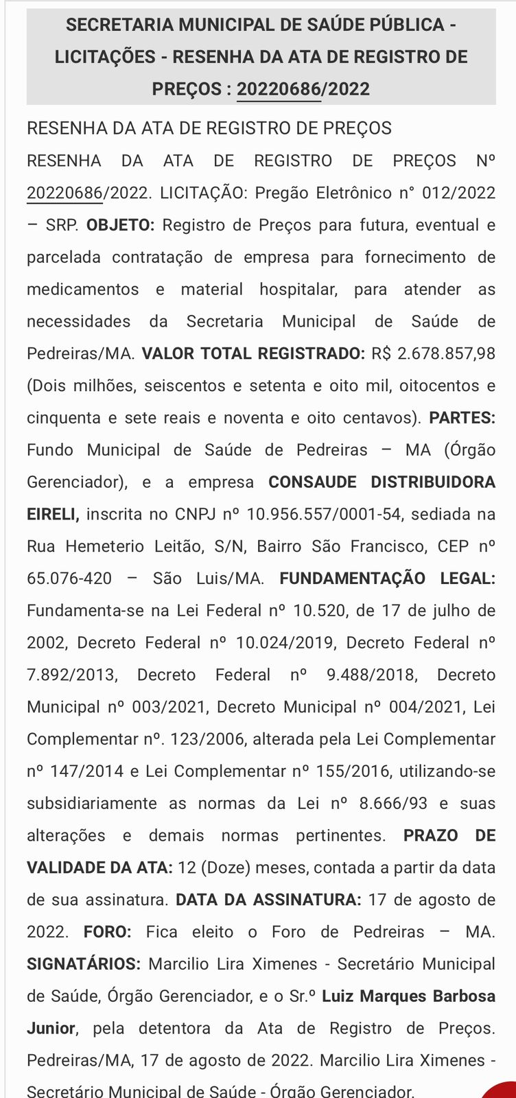 CONSAUDE DISTRIBUIDORA EIRELI, valor R$ 2.678.857,98 (Dois milhões, seiscentos e setenta e oito mil, oitocentos e cinquenta e sete reais e noventa e oito centavos);