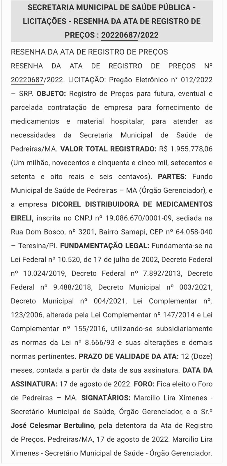 DICOREL DISTRIBUIDORA DE MEDICAMENTOS EIRELI, valor R$ 1.955.778,06 (Um milhão, novecentos e cinquenta e cinco mil, setecentos e setenta e oito reais e seis centavos);