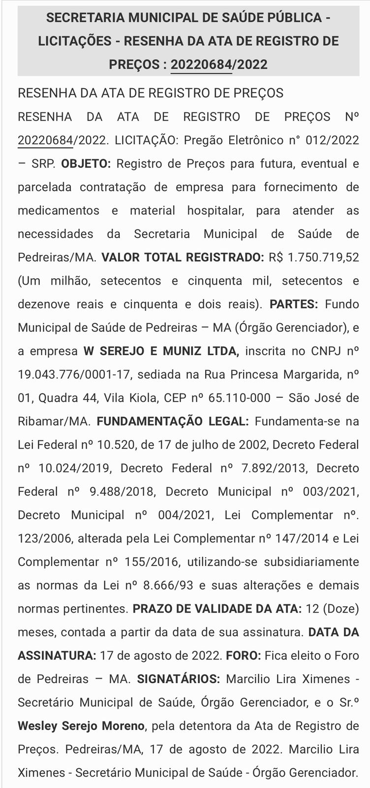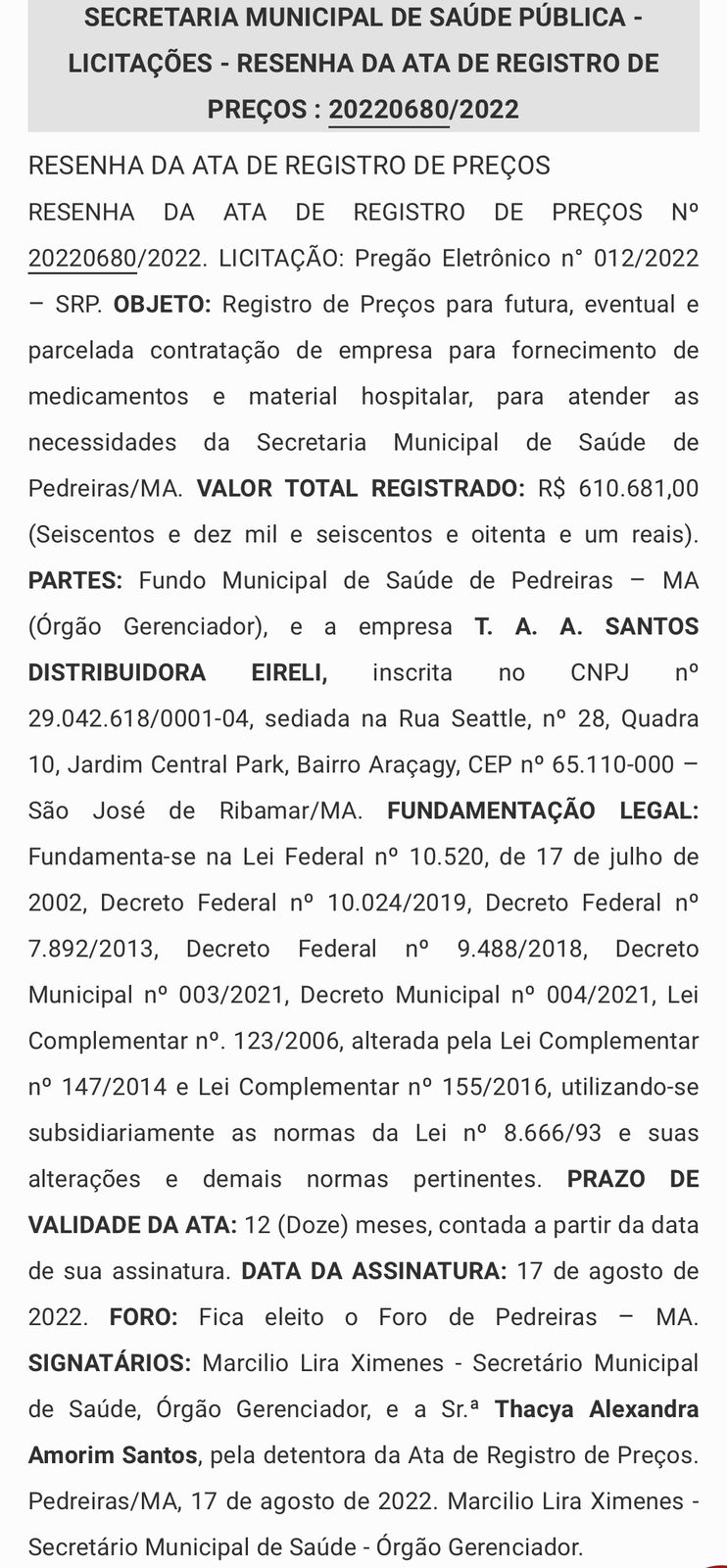 e T. A. A. SANTOS DISTRIBUIDORA EIRELI, valor R$ 610.681,00 (Seiscentos e dez mil e seiscentos e oitenta e um reais);