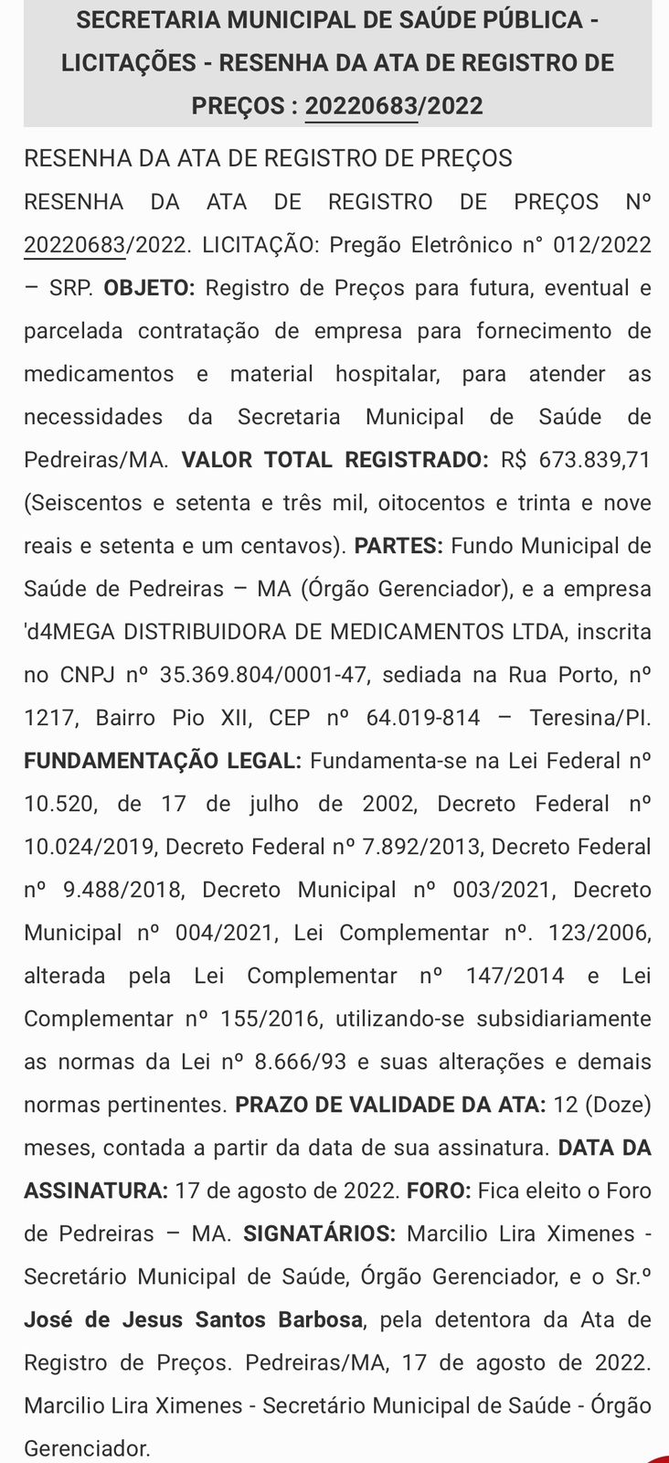 d4MEGA DISTRIBUIDORA DE MEDICAMENTOS LTDA, valor R$ 673.839,71 (Seiscentos e setenta e três mil, oitocentos e trinta e nove reais e setenta e um centavos);