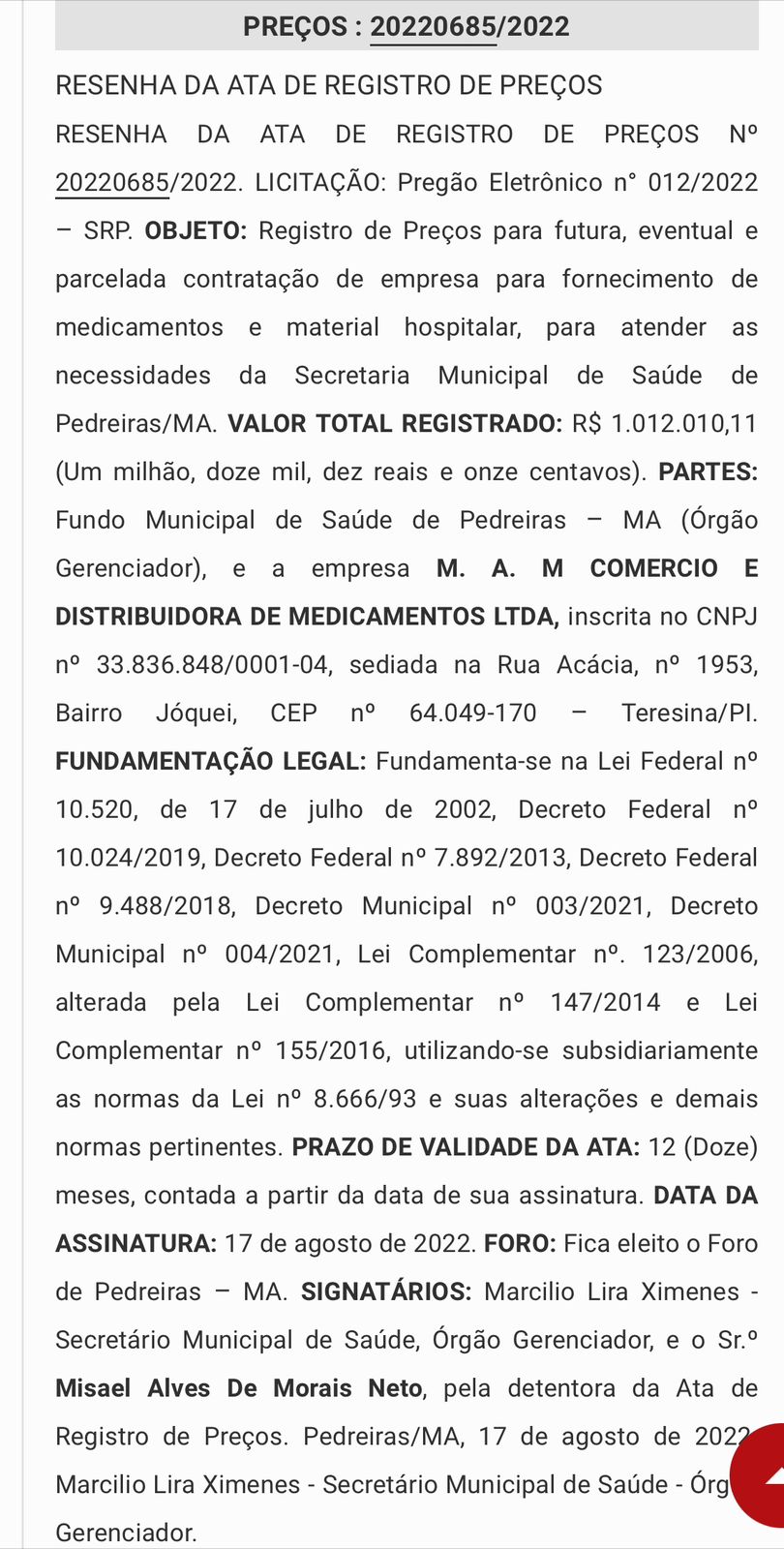 - A. M COMERCIO E DISTRIBUIDORA DE MEDICAMENTOS LTDA, valor R$ 1.012.010,11 (Um milhão, doze mil, dez reais e onze centavos);