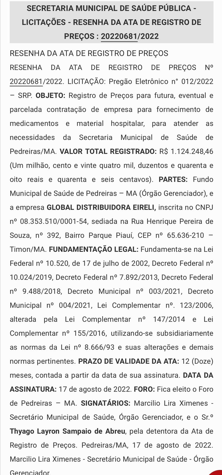 GLOBAL DISTRIBUIDORA EIRELI, valor R$ 1.124.248,46 (Um milhão, cento e vinte quatro mil, duzentos e quarenta e oito reais e quarenta e seis centavos);