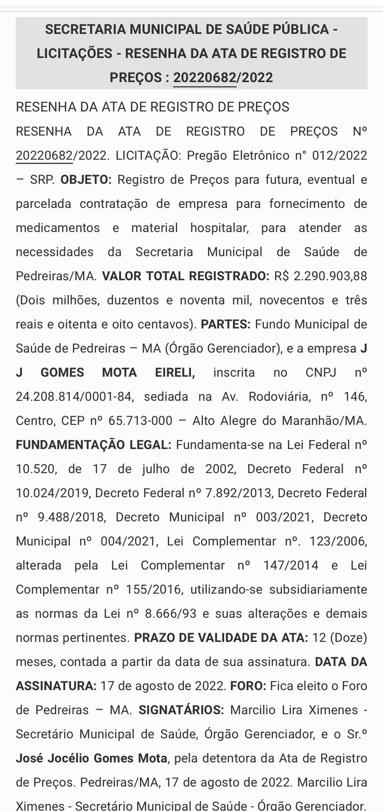 J J GOMES MOTA EIRELI, valor R$ 2.290.903,88 (Dois milhões, duzentos e noventa mil, novecentos e três reais e oitenta e oito centavos);