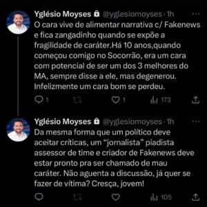Yglesio Moyses falou sobre o episódio na manhã desta terça-feira (28): “O cara vive de alimentar narrativa com fake news e fica zangadinho quando se expõe a fragilidade de caráter. Há 10 anos, quando começou comigo no Socorrão, era um cara com potencial para ser um dos 3 melhores do MA, sempre disse a ele, mas degenerou. Infelizmente, um cara bom se perdeu”, declarou.