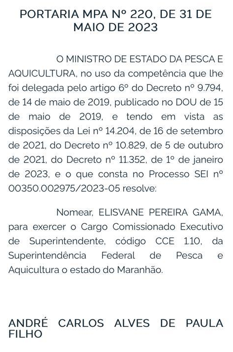 A nomeação da irmã da senadora para o posto foi publicada no Diário Oficial da União da última quarta-feira (31), assinada pelo ministro da Pesca e Aquicultura, André de Paula.