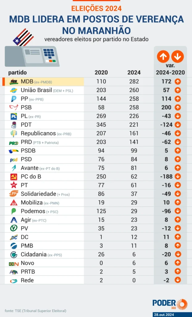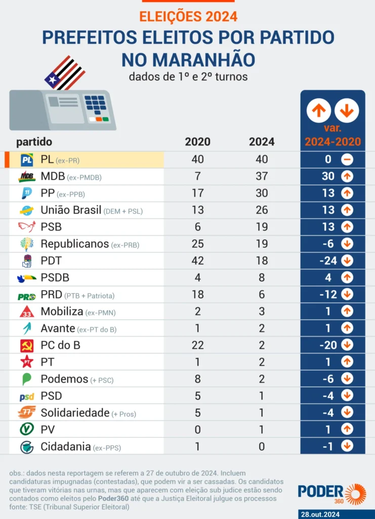 O saldo das eleições municipais deste ano no Maranhão foi especialmente positivo para duas legendas: o PL, de Josimar de Maranhãozinho, e o MDB, controlado por Marcus Brandão.