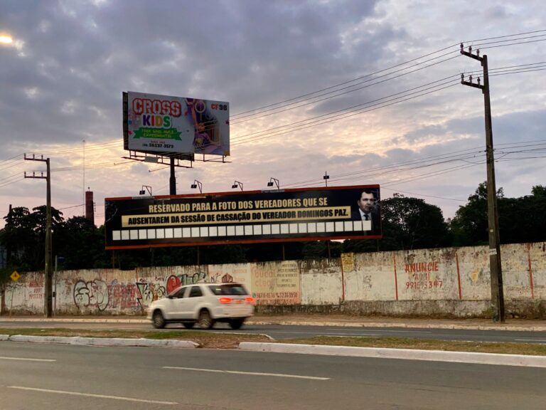 Três placas publicitárias, instaladas em avenidas de grande fluxo de São Luís, prometem expor as imagens dos vereadores que não comparecerem à sessão extraordinária que acontece na manhã desta sexta-feira (09).