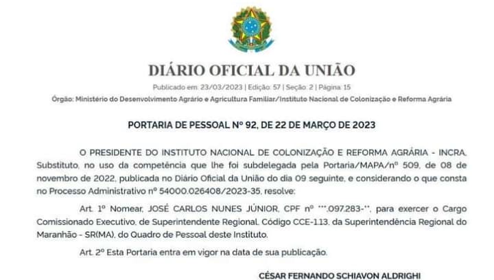 O ex-deputado federal Zé Carlos foi nomeado superintendente do Instituto Nacional de Colonização e Reforma Agrária (Incra) no Maranhão, nesta quinta-feira (23).