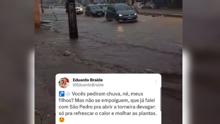 “Vocês pediram chuva, né, meus filhos?!? Mas não se empolguem, que já falei com São Pedro pra abrir a torneira devagar. Só pra refrescar o calor e molhar as plantas. Ainda temos muitas obras acontecendo na cidade”, brincou o prefeito.
